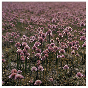 Kuddfodral. Fält med rosaskimrande Trift i närheten av Friggars